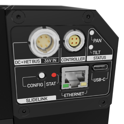 В голове, как и в других устройствах Slidekamera, используются сверхпрочные разъемы LEMO. Конструкция как головы, так и электроприводов обеспечивает питание и передачу данных по одному кабелю, что позволяет работать быстрее и безопаснее и уменьшить количество используемых проводов.